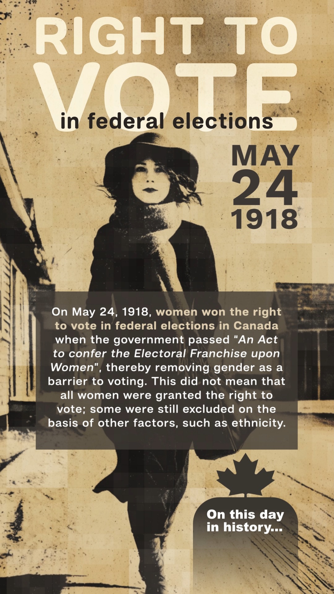 #OnThisDay in #CanadianHistoryOn May 24, 1918, women won the right to vote in federal elections in Canada when the government passed “An Act to confer the Electoral Franchise upon Women”, thereby removing gender as a barrier to voting. This did not mean that all women were granted the right to vote; some were still excluded on the basis of other factors, such as ethnicity.#TodayinHistory #CanadianHistory #Womensrights #RighttoVote #canadaSources: