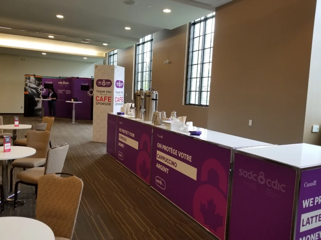 Adapted and implemented existing agency-created branding for the full environmental graphics package of a CDIC/SADC event booth (café/counter wraps and pillars).