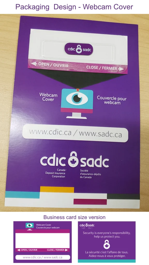 Designed the bilingual packaging for the CDIC webcam cover. Ensured inclusion of all corporate branding, bilingual instructions, and regulatory URLs. Adapted the final design to a business card format for printing.